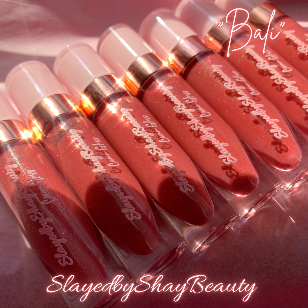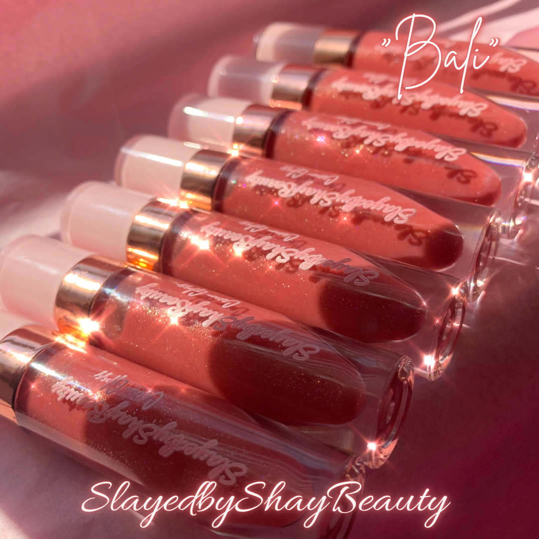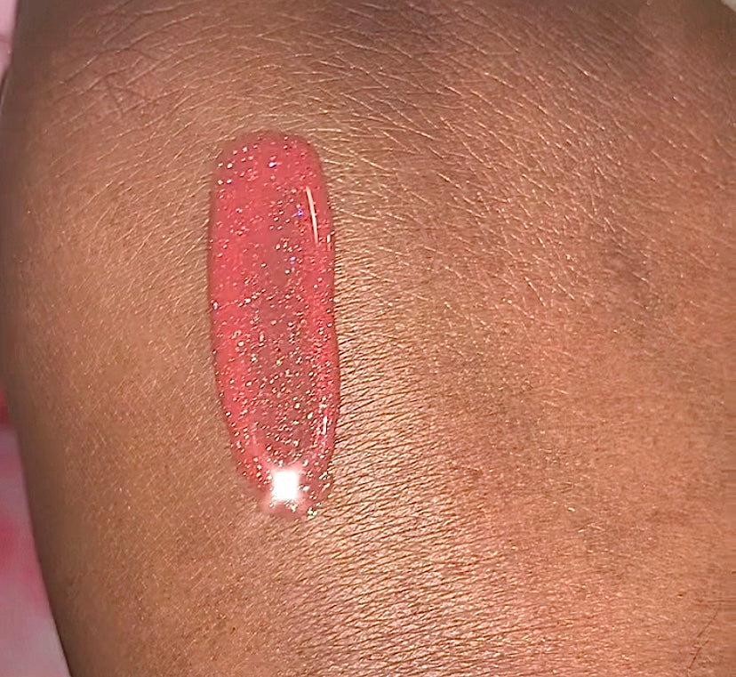 A pinky/orange nude with traces of white, bronze & rose gold glitter. It has a creamy non sticky formula thanks to vitamin E. We also added fractionated coconut oil to provide intense hydration on the lips. This gloss is snickerdoodle scented/flavored